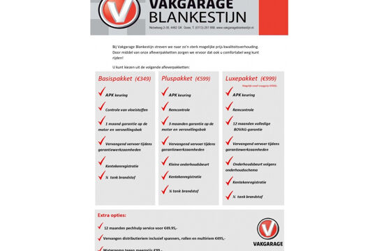 Deze advertentie en de inhoud ervan is met de grootst mogelijke zorg samengesteld. Het is echter mogelijk dat de gehanteerde advertentietekst licht afwijkt van de opties/accessoires die werkelijk op de auto zitten. Er kunnen derhalve aan deze advertentie geen rechten worden ontleend. Vakgarage Blankestijn kan nooit aansprakelijk worden gesteld voor de inhoud en volledigheid van de verstrekte informatie.